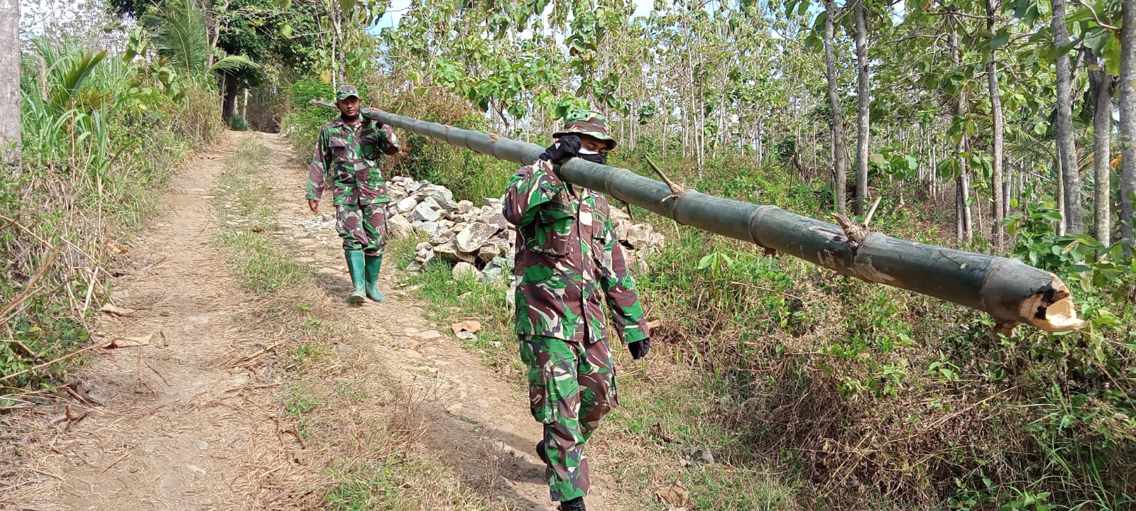 Batang pohon bambu bersama-sama dibawa ke beberapa titik sasaran fisik Pra TMMD Reguler ke-112 Kodim 0720/Rembang di Desa Trembes.( Trisno /Pendim 0720/Rembang).