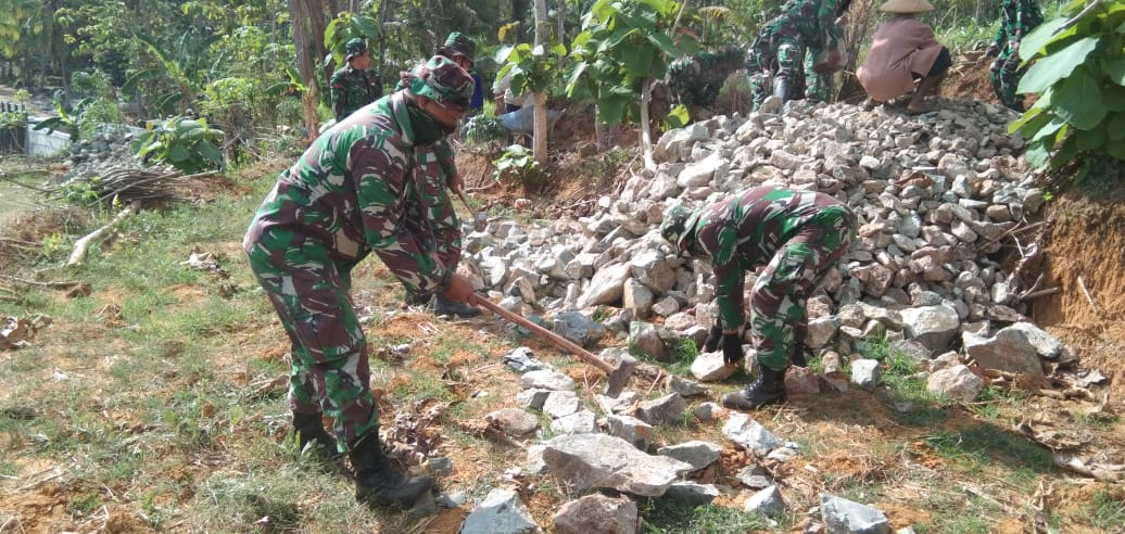 Penyiapan material bahan baku dalam program TMMD Reguler ke 112 Kodim 0720/Rembang tahun 2021 yang saat ini dilaksanakan di desa Trembes, Kecamatan Gunem, Kabupaten Rembang dengan sasaran utama makadam jalan dan pembuatan jembatan.