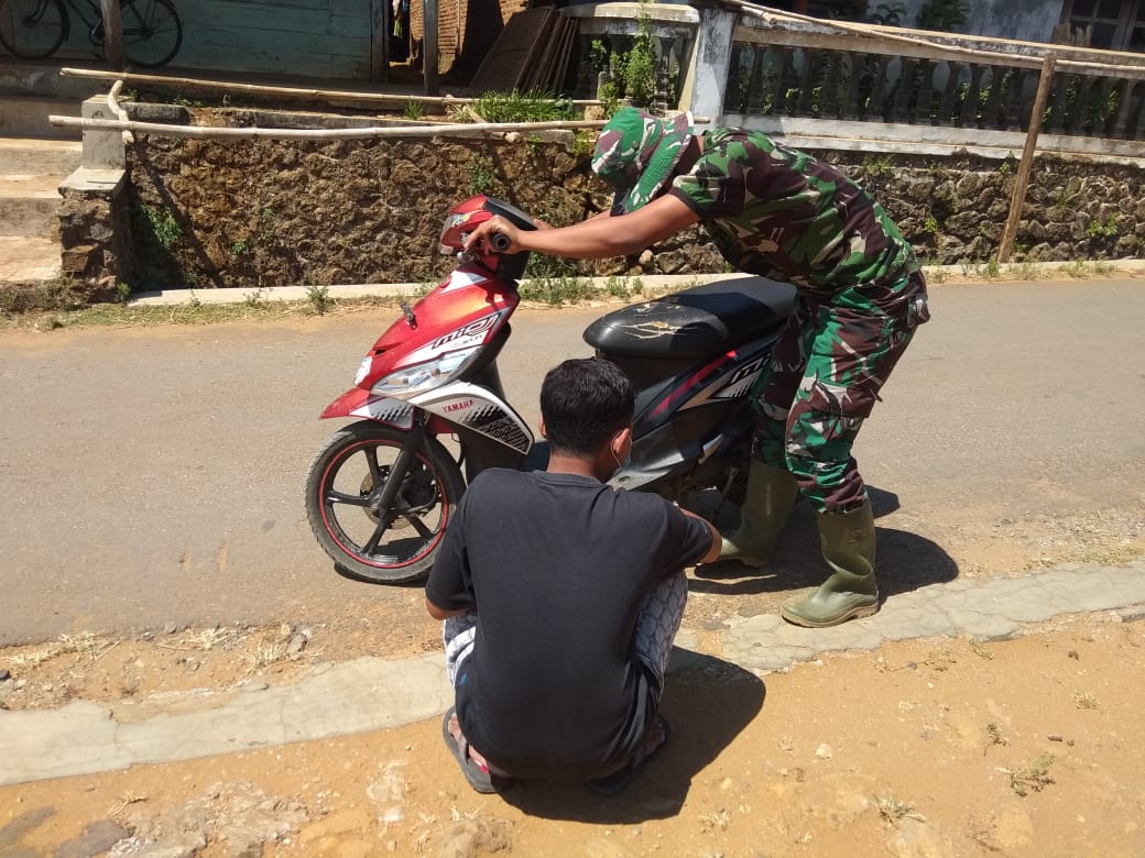 Prajurit Satgas TMMD reg – 112 Kodim Rembang, Untuk membantu sesama tidak boleh tebang pilih, dan menunggu yang di bantu meminta tolong, itulah gambaran yang ada saat ini di lokasi TMMD Desa Trembes Kecamatan Gunem Kabupaten Rembang, Hamzah (13) anak warga Trembes yang bocor ban sepeda motornya. Jum’at (24/09/2021)