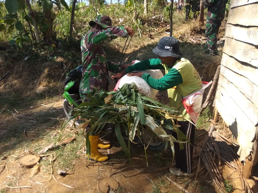 Warga dalam aktivitas mencari rumput untuk pakan ternak. Prajurit TNI yang menmpati rumah milik warga membantu mencarikan dan mencari rumput untuk keperluan pakan ternak.