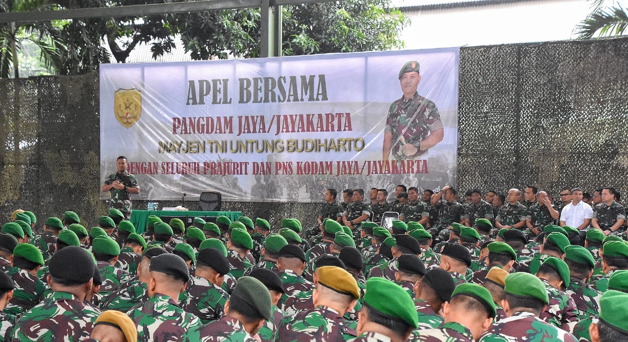 Pangdam Jaya Mayjen TNI Untung Budiharto gelar apel bersama Prajurit dan PNS Kodam Jaya secara langsung dan melalui Vidcon guna memberikan pengarahan, bertempat di lapangan tenis Jasdam, Makodam Jaya, Cililitan, Jakarta Timur. Rabu (15/03/2023).