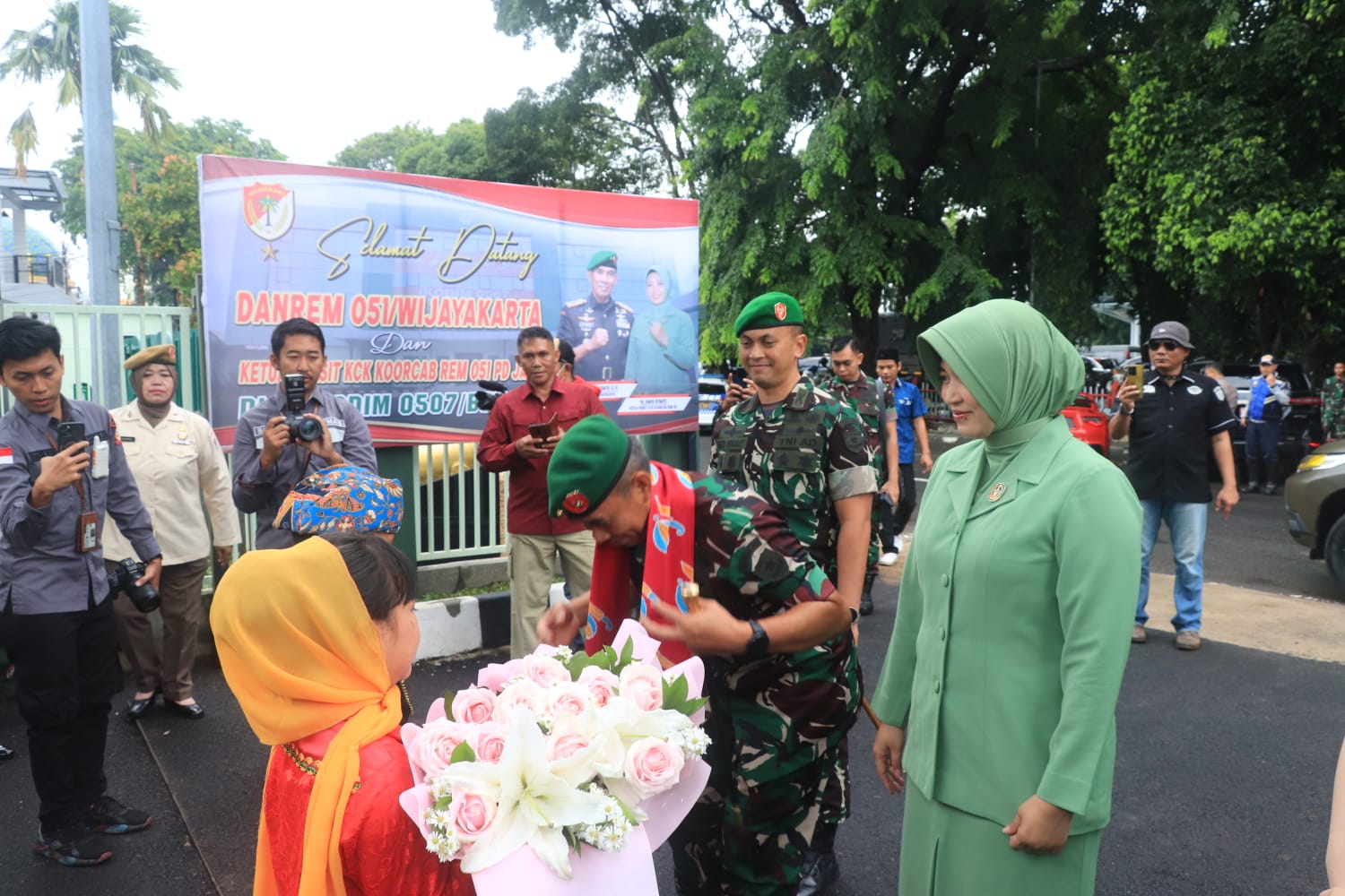 Kedatangan Danrem 051 beserta rombongan disambut oleh Dandim 0507/Bekasi Kolonel Arm Rico Ricardo Sirait, B.S., M.MDS., di dampingi Ketua Persit KCK Cabang XXI Dim 0507 Ny. Fitri Rico Ricardo, dan menerima pengalungan syal serta Hand bouquet untuk Ibu Ketua Persit KCK PD Jaya Ny.Nanik Riyanto.