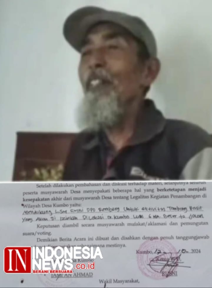 Kepada pihak penambang, Rusni mempertanyakan apakah ada buktinya izin resmi dari pemerintah. Setelah itu, orang suruhan pengusaha tambang mengantarkan dokumen berita acara musyawarah desa (Musdes) legalitas penambangan di Desa Kumbo.