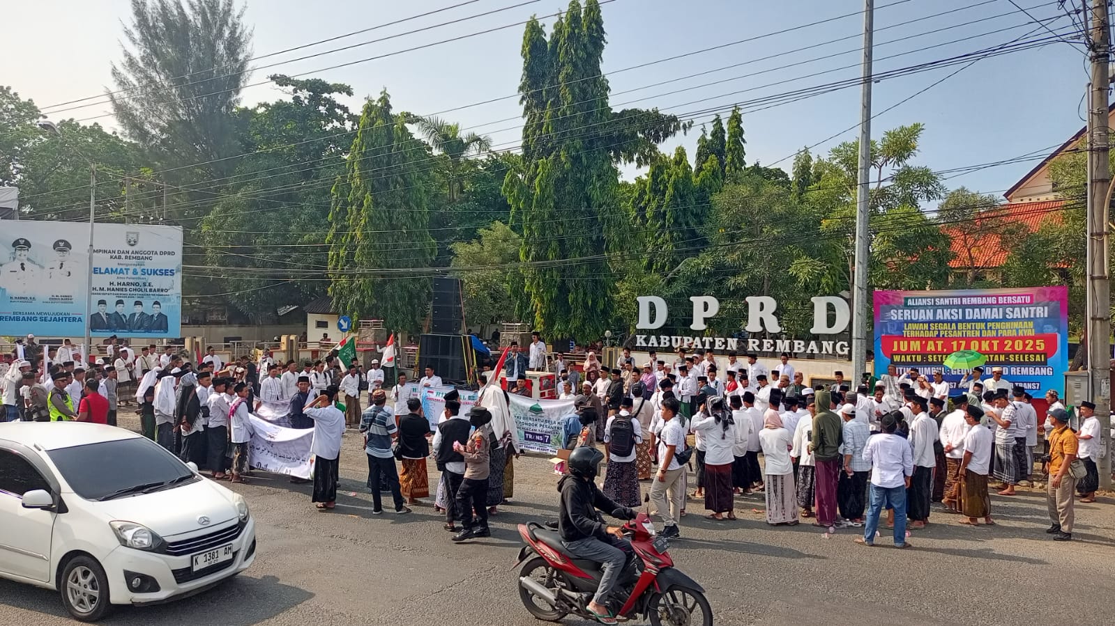 Ratusan santri Rembang melakukan aksi damai di depan Gedung DPRD Kabupaten Rembang pada Jumat siang (17/10/2025). Mereka datang sekitar pukul 14.00WIB dengan satu mobil komando.