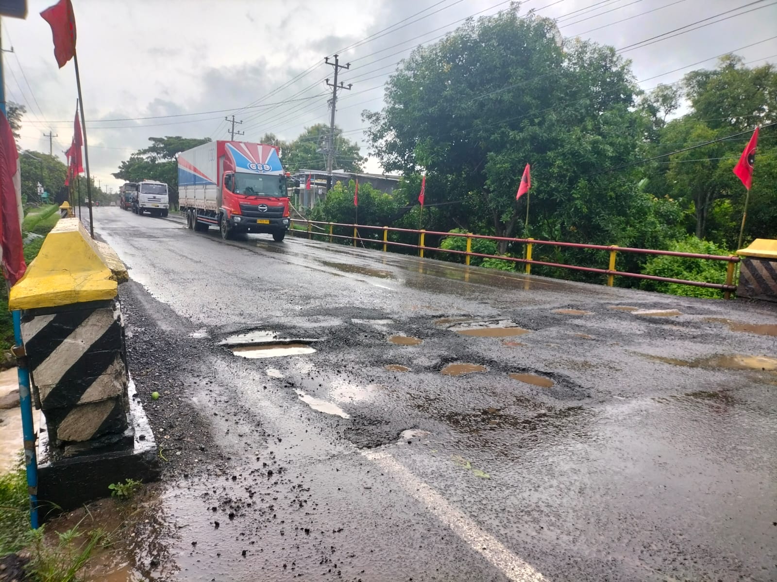 Jalan sekitar Jembatan utama penghubung jalur Nasional Pantura kondisinya rusak dan berlubang. Jika tidak waspada bisa mengancam keselamatan pengendara.