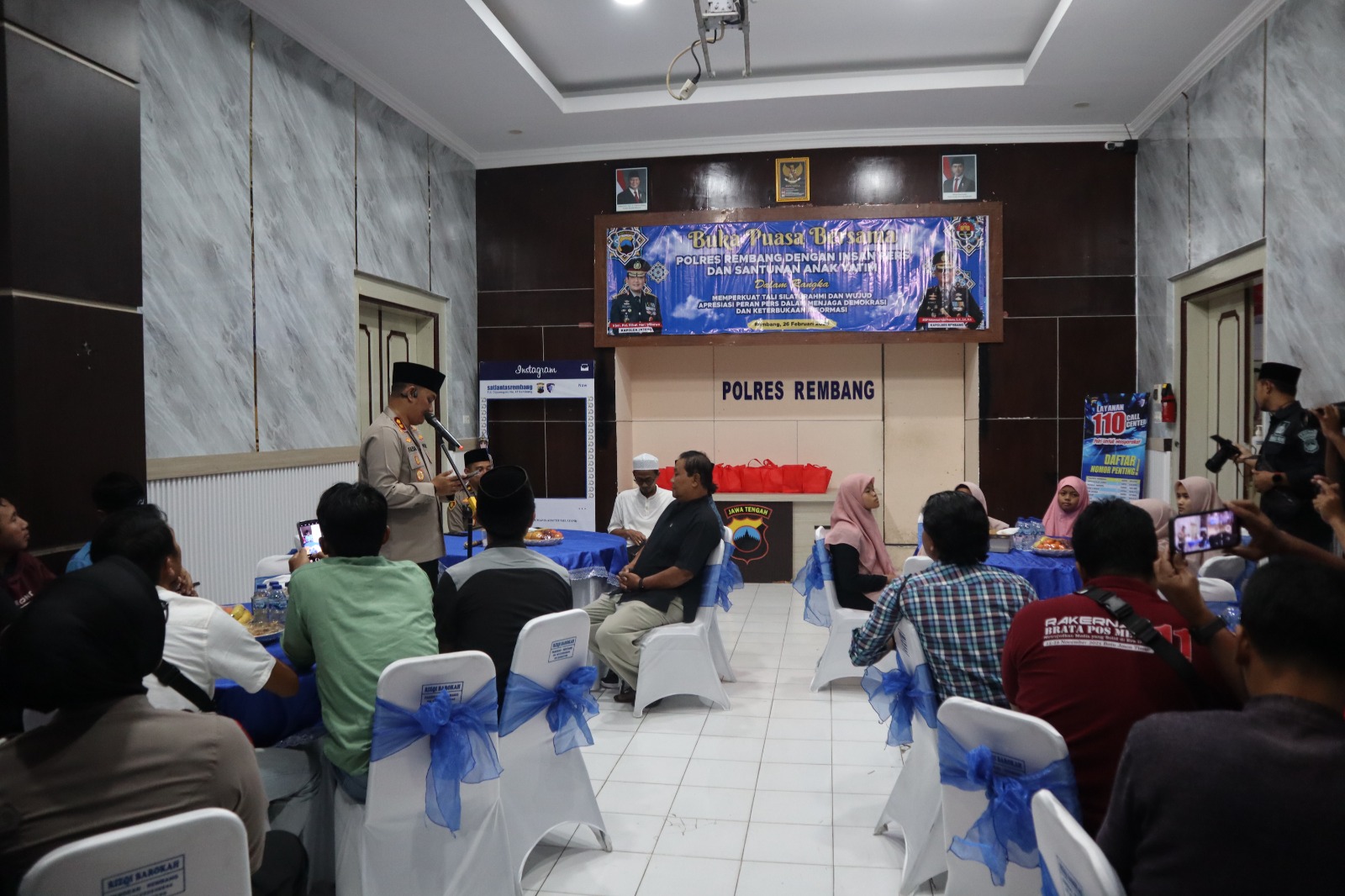 Kapolres Rembang AKBP Mohammad Faisal menyampaikan rasa syukur atas terselenggaranya kegiatan silaturahmi tersebut dalam keadaan sehat dan penuh kebersamaan. Ia berharap momentum buka puasa bersama ini dapat semakin mempererat sinergitas antara Kepolisian dan insan pers.